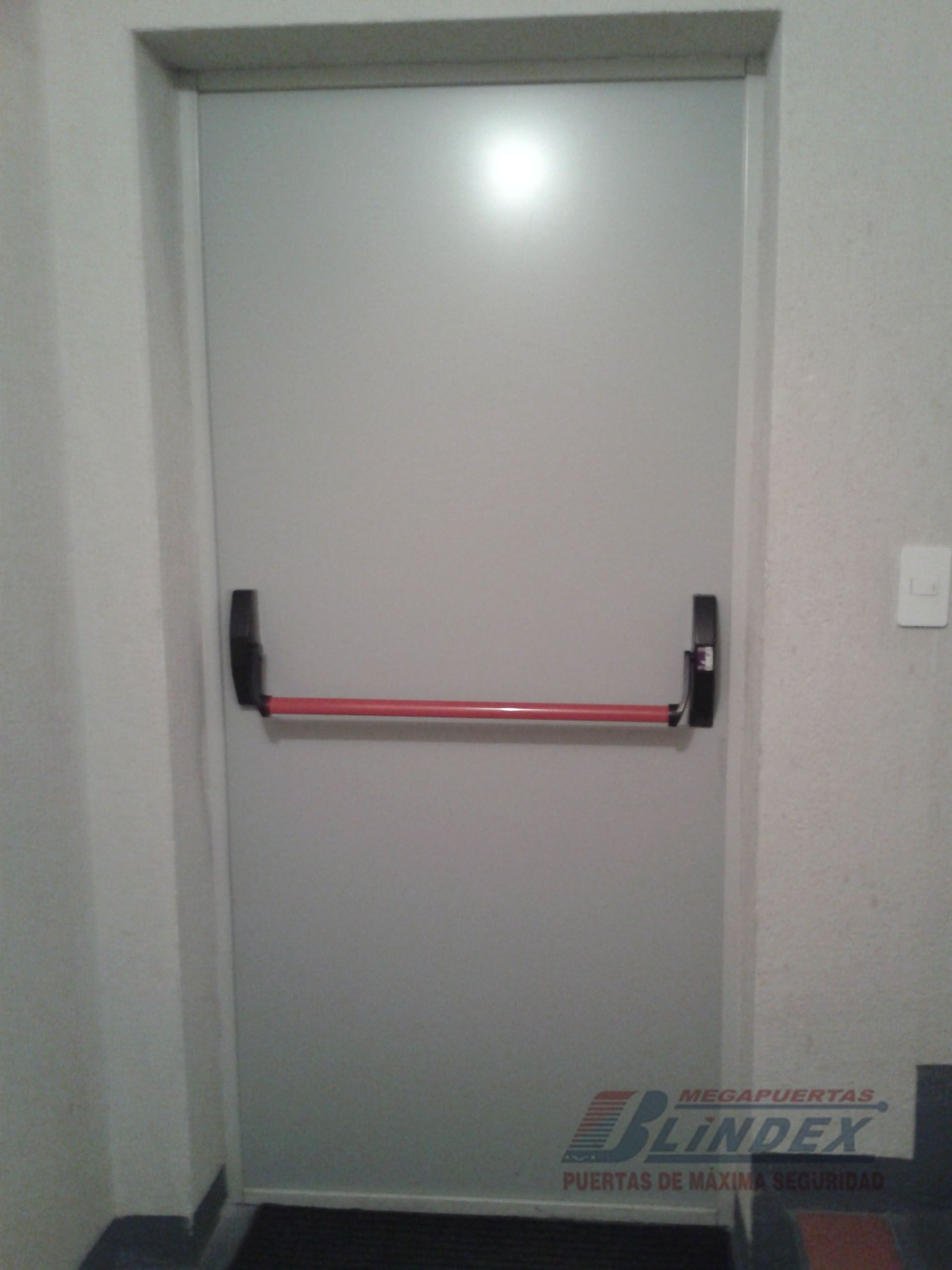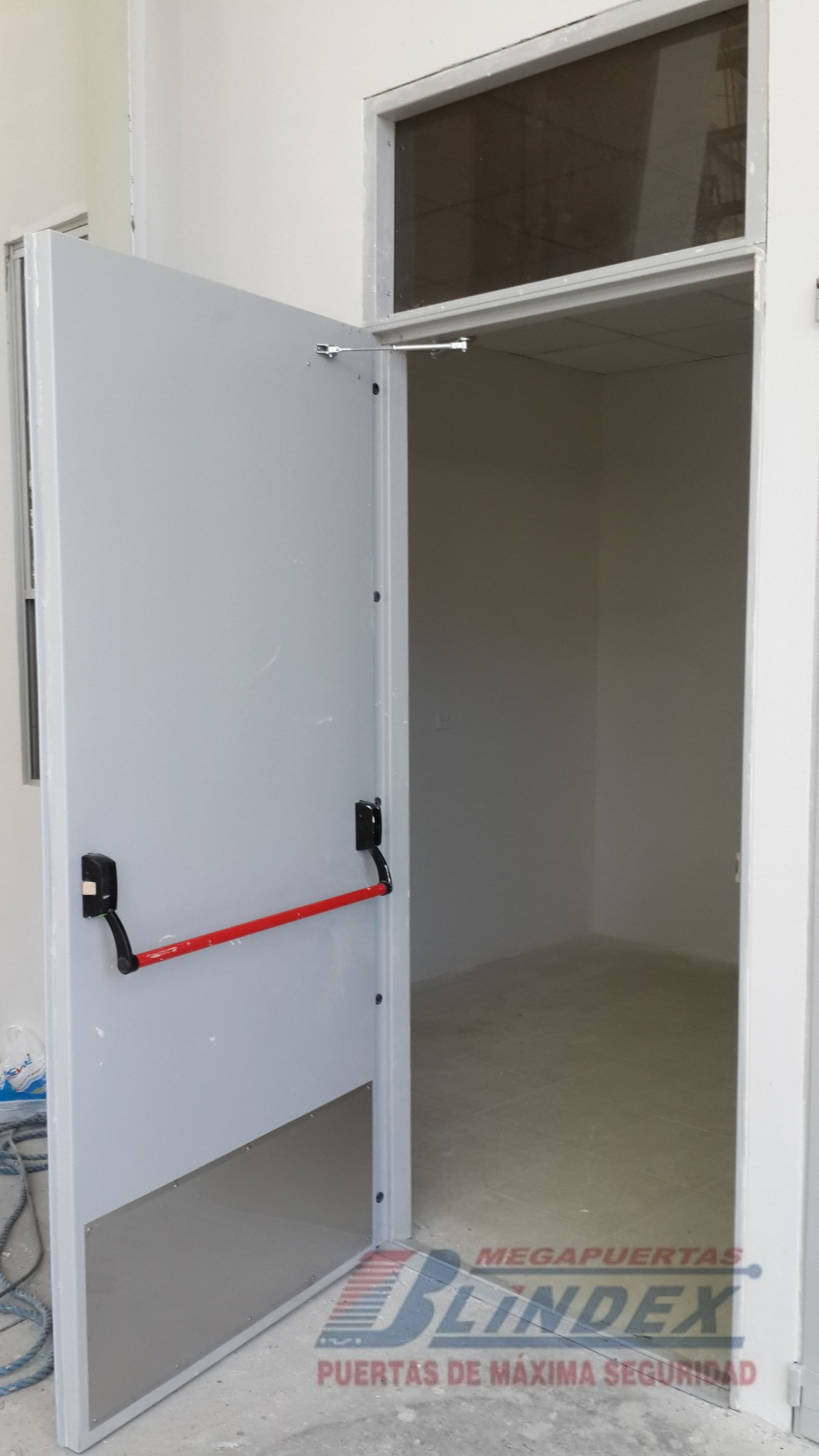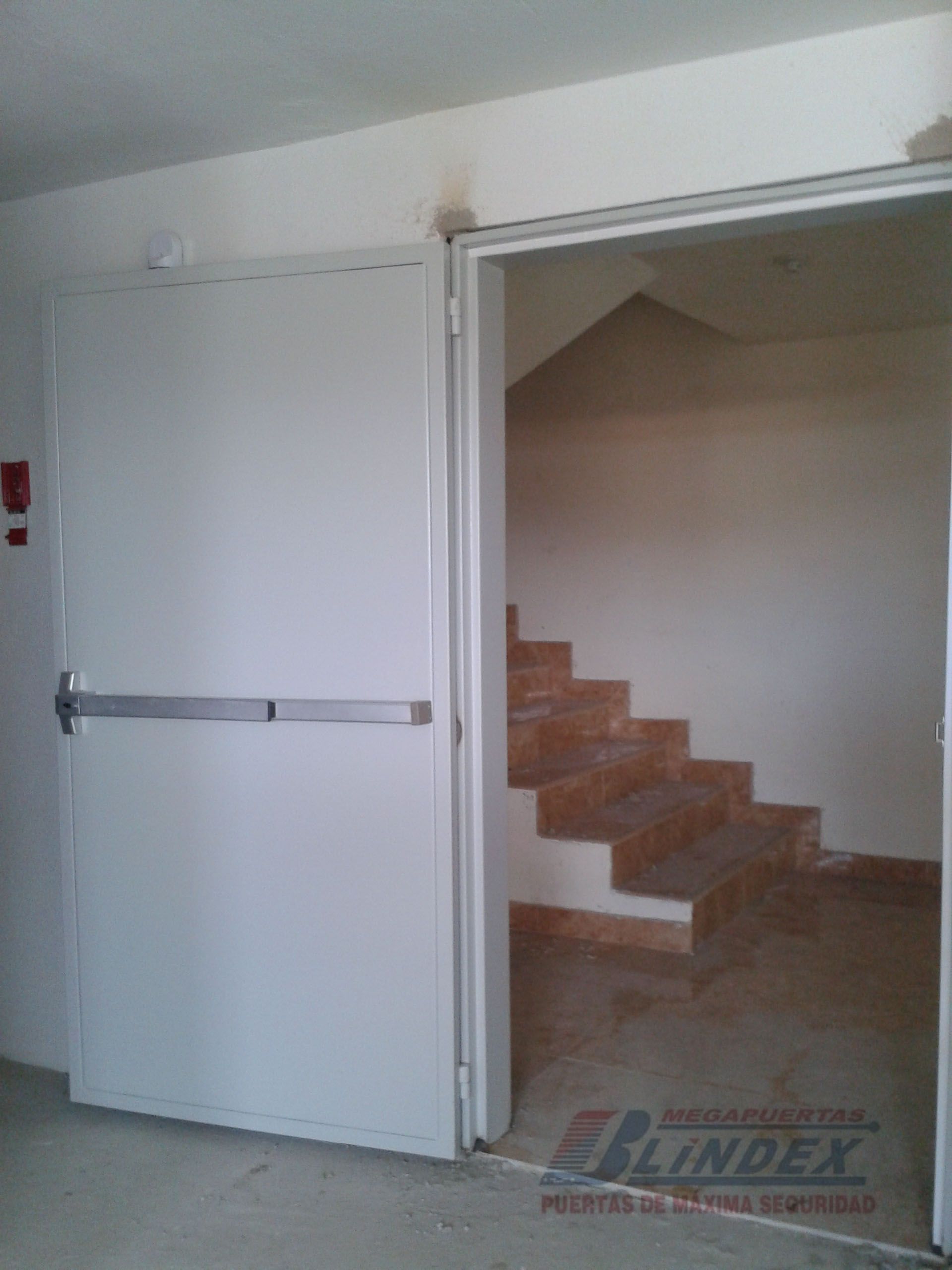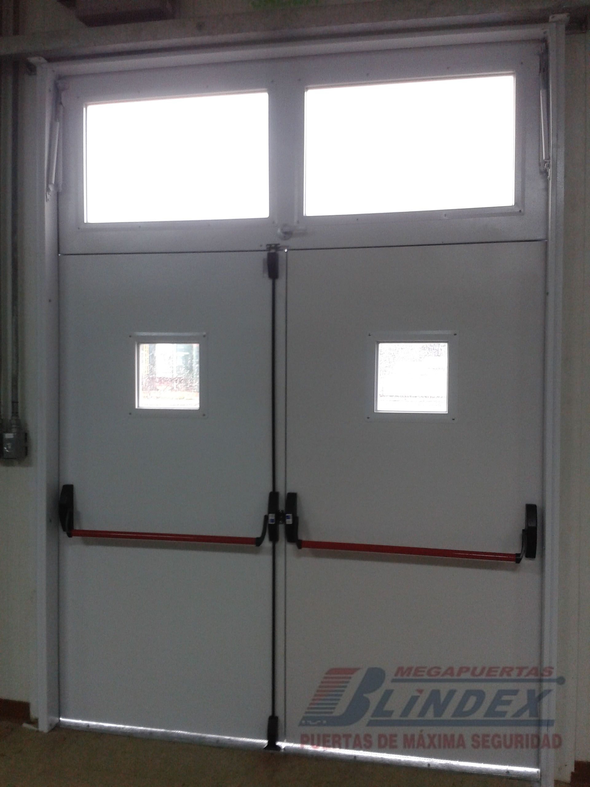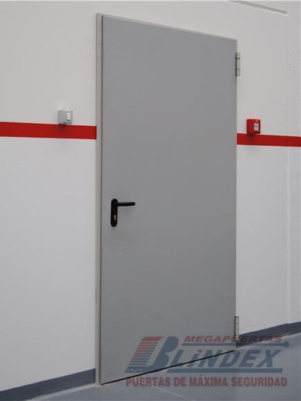 Marco y hoja en acero galvanizado, relleno de lana de roca balsática, cerradura, barra antipánico y pintura electrostática.