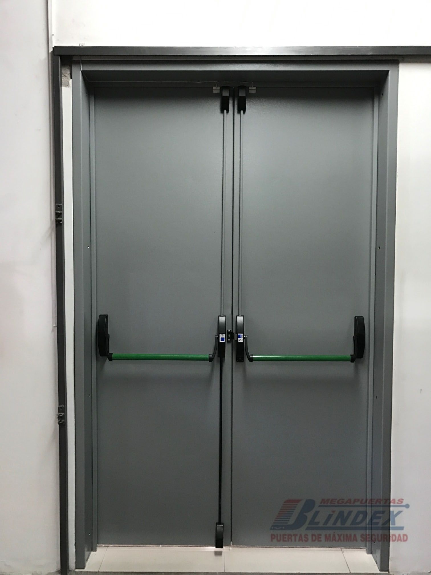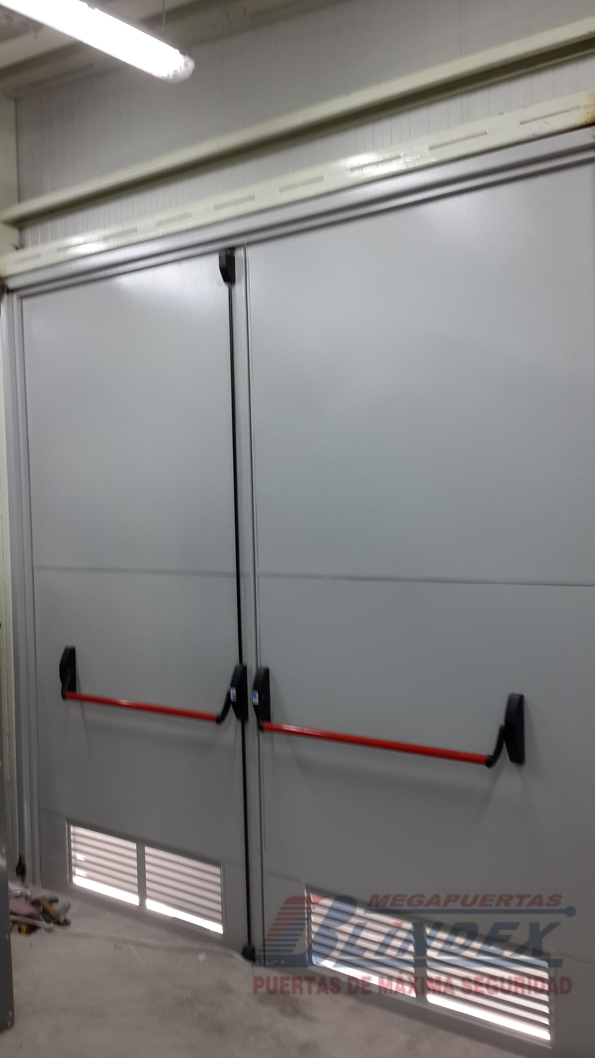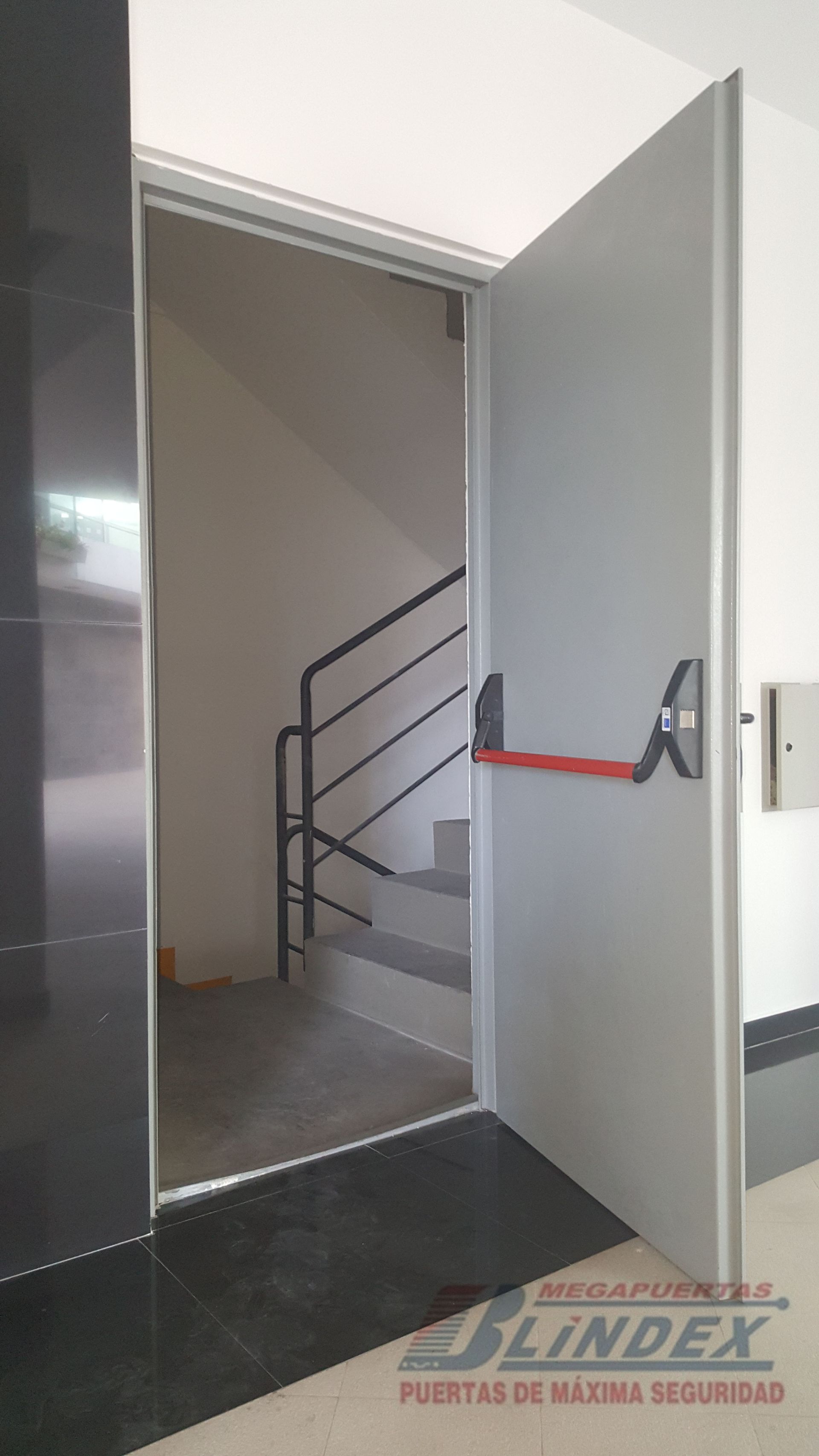 Marco y hoja en acero galvanizado, relleno de lana de roca balsática, cerradura, barra antipánico y pintura electrostática.