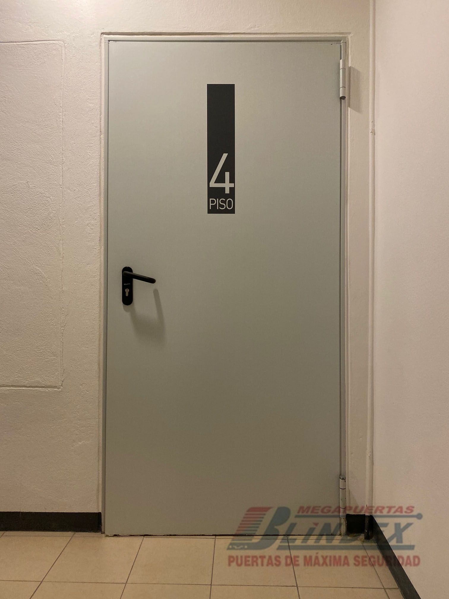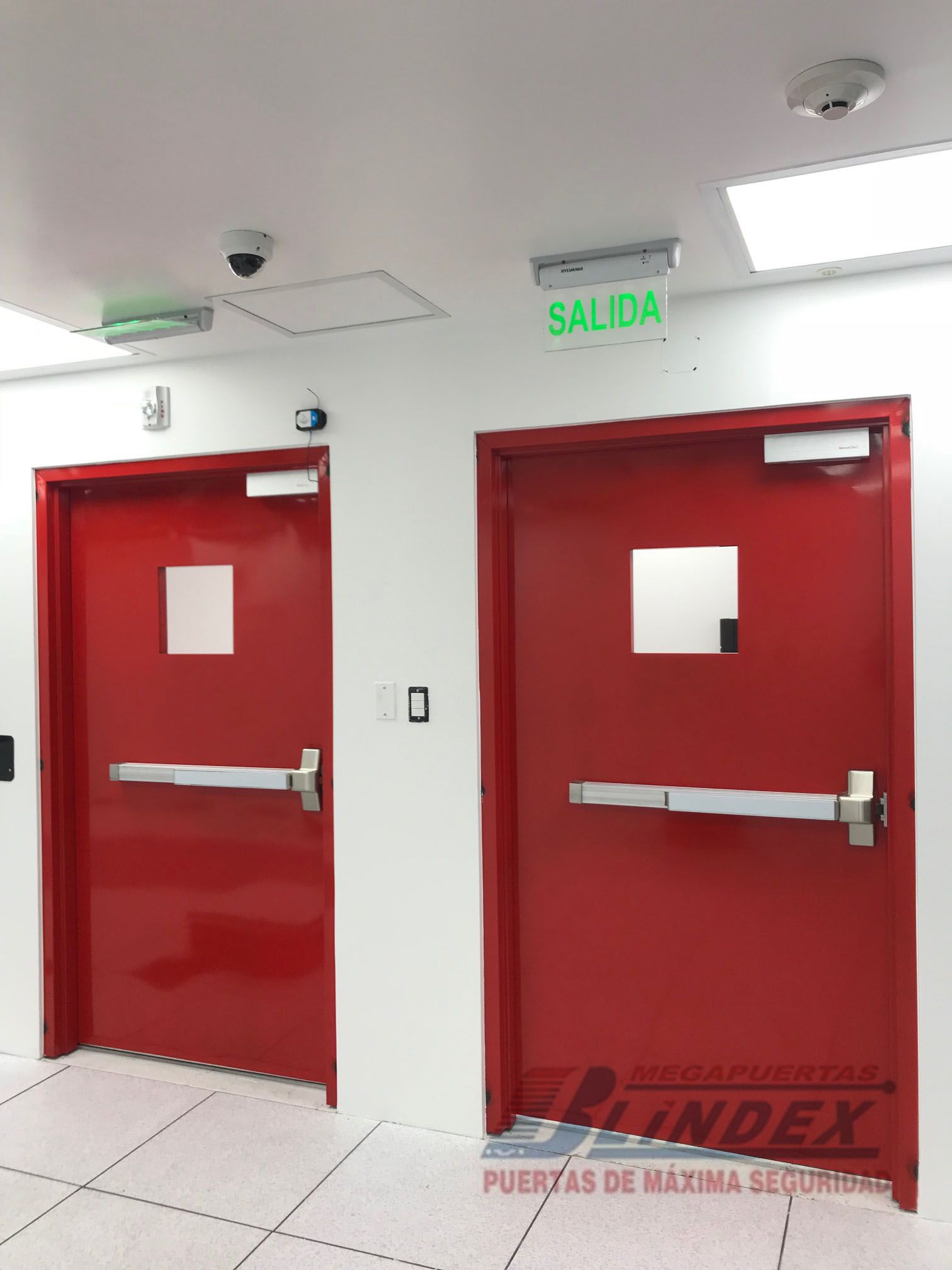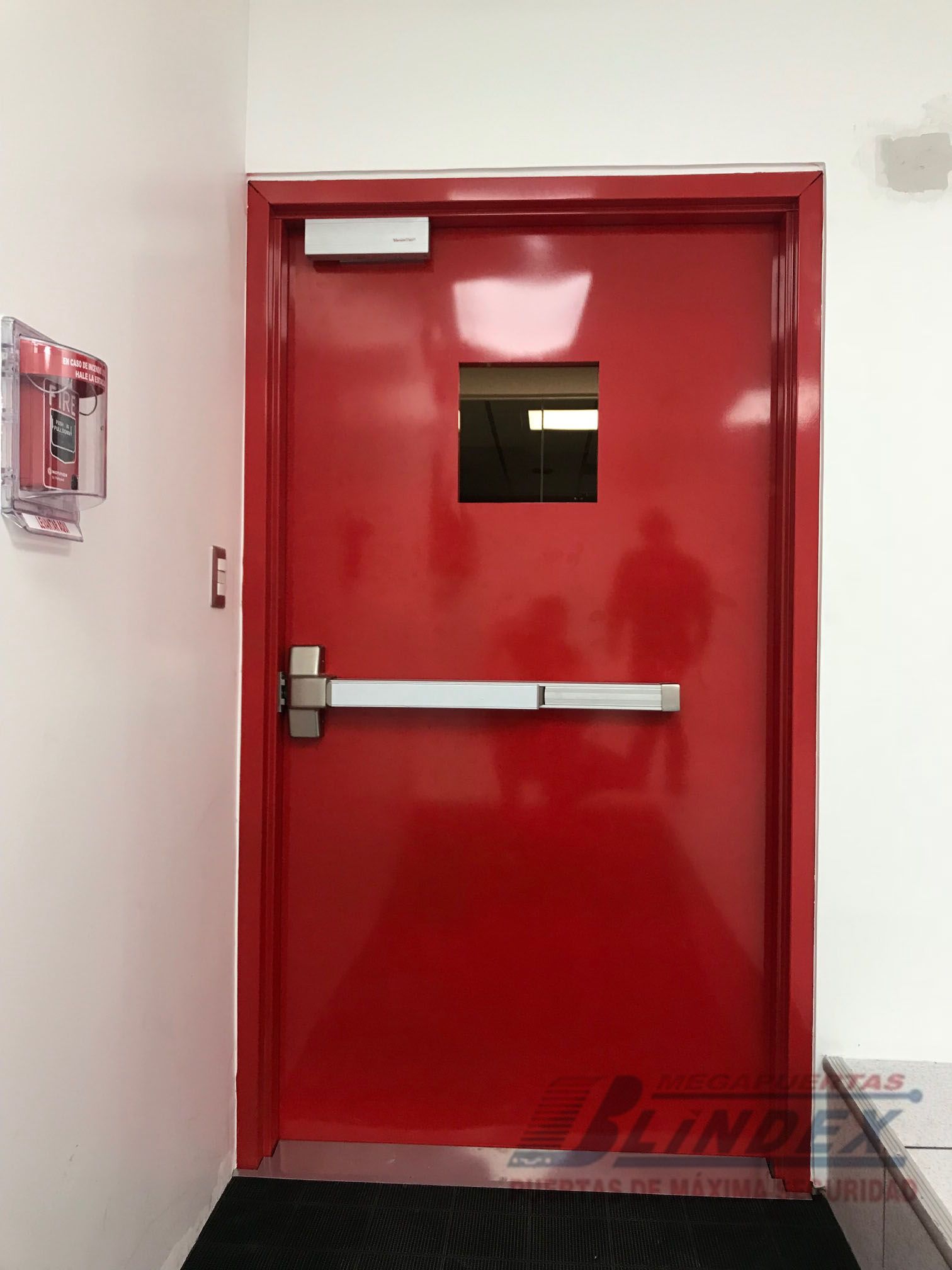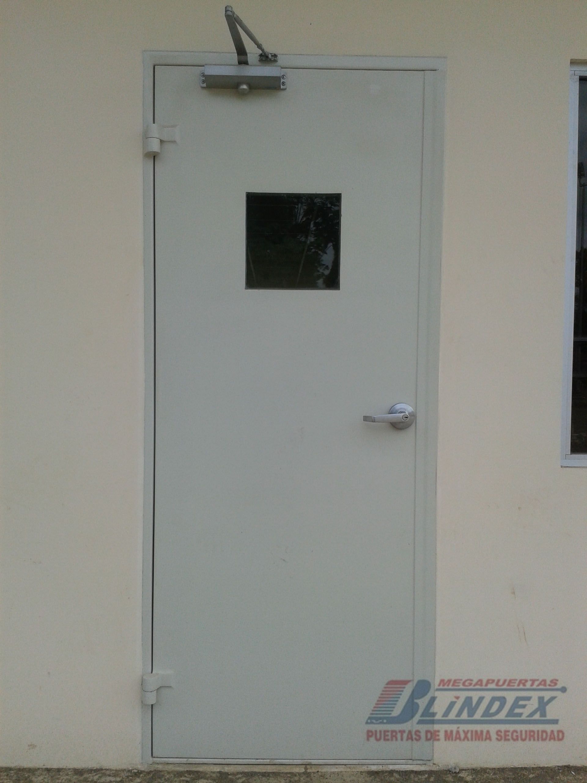 Marco y hoja en acero galvanizado, relleno de lana de roca balsática, cerradura, barra antipánico y pintura electrostática.