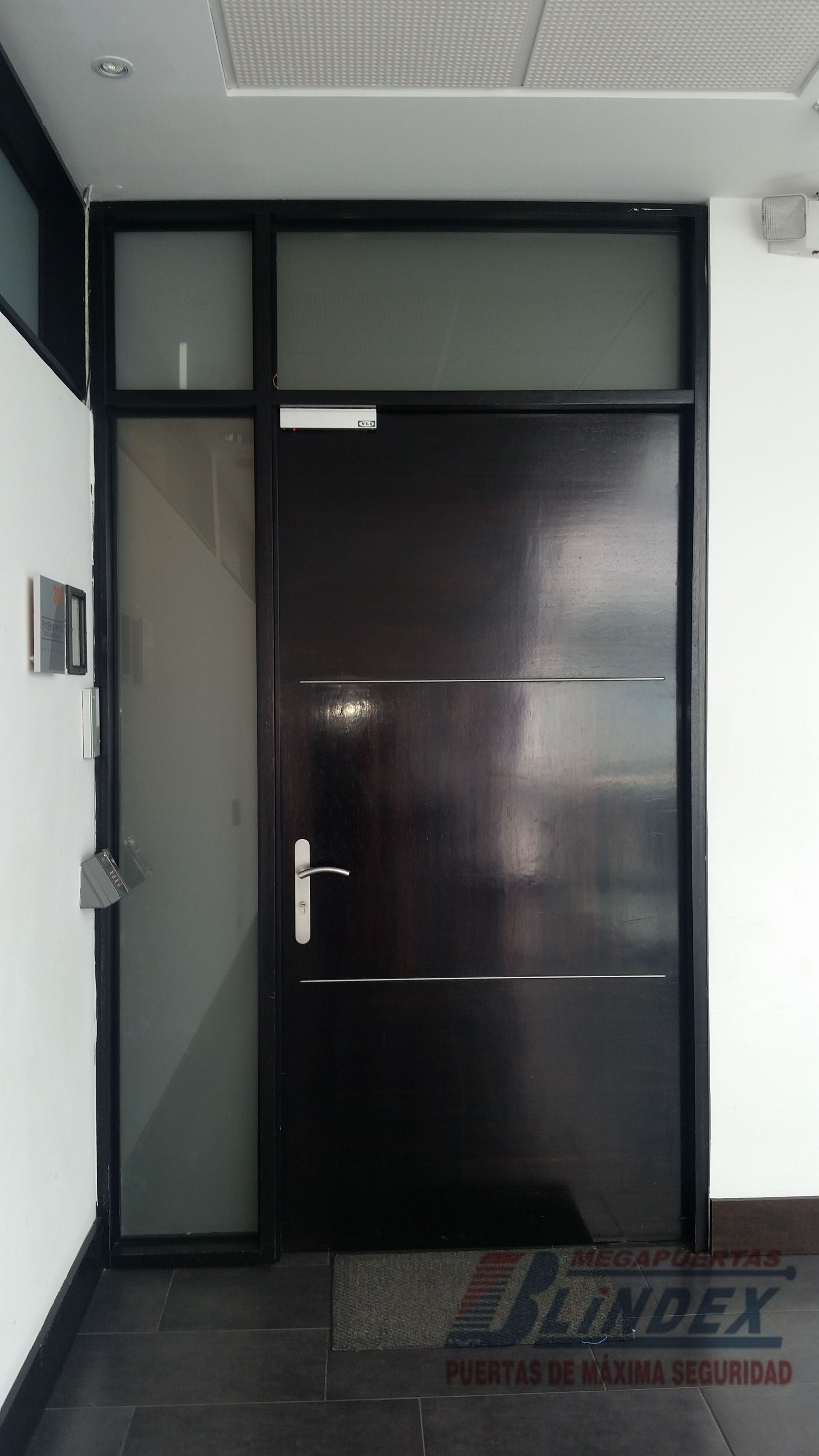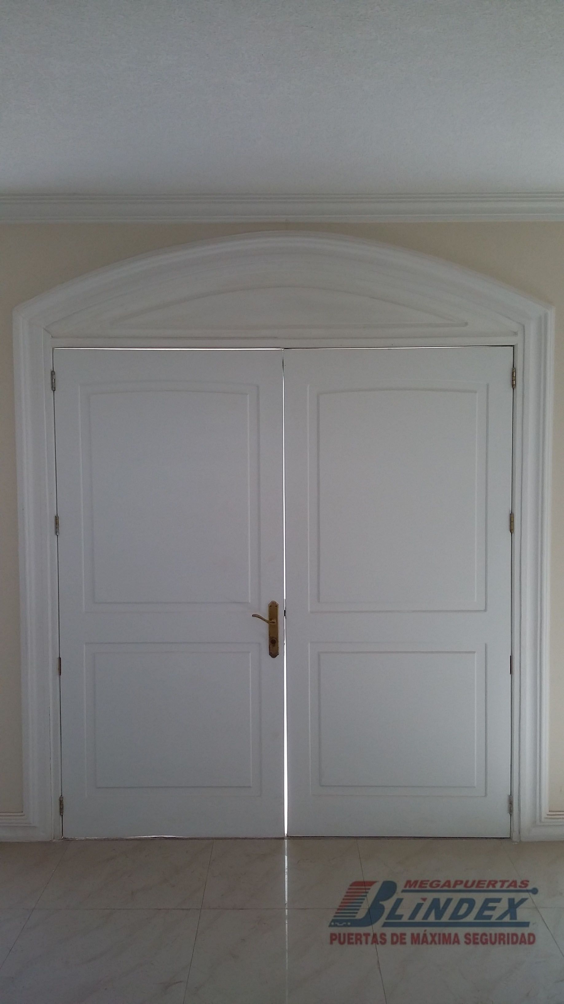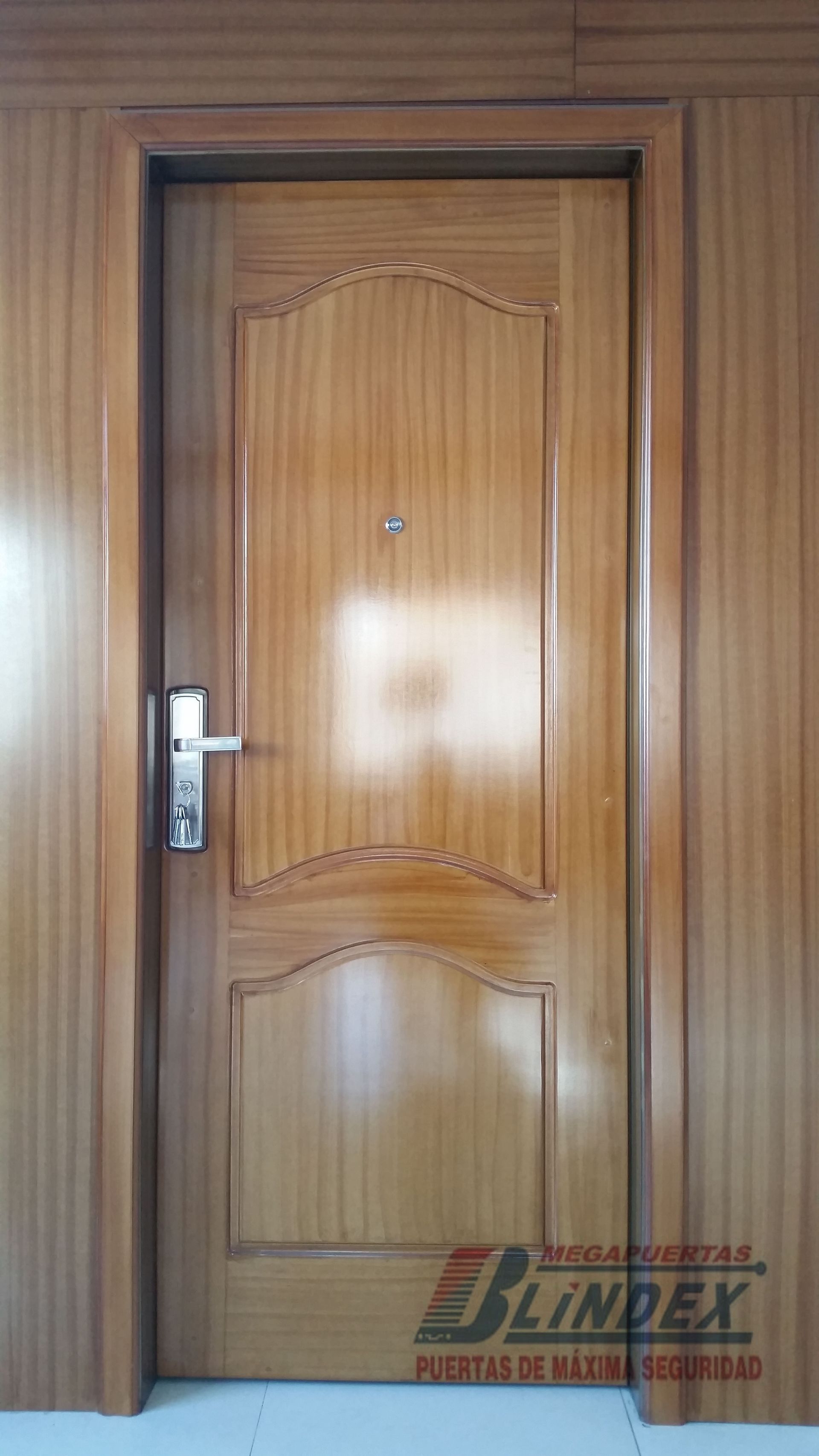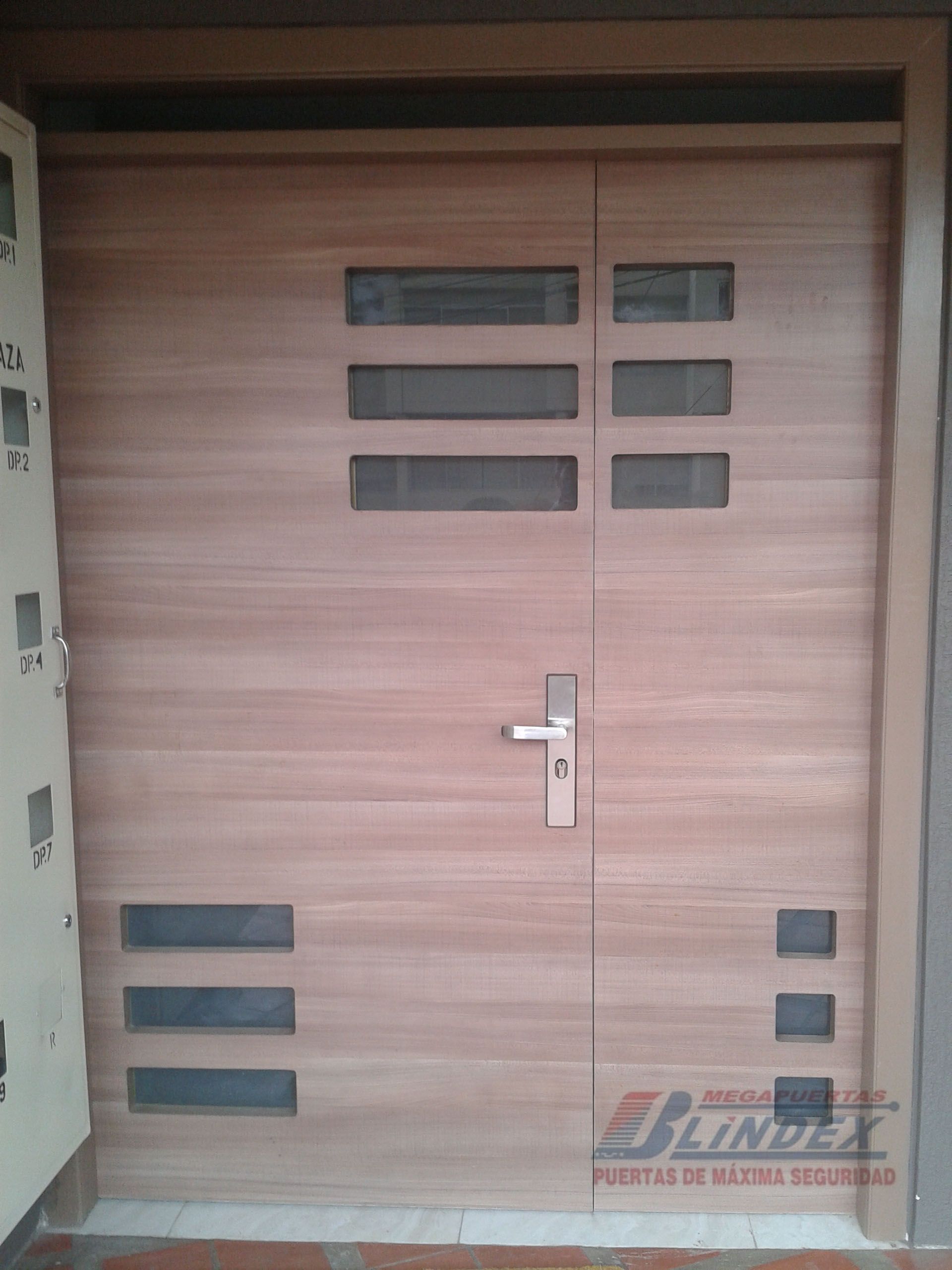 Residencias, comercios, bancos, cuartos de pánico, marcos y hoja en plancha galvanizada con refuerzos anti palanca, omegas internos tipo panal, relleno de lana de roca, cerradura española con 10 puntos de anclaje y enchape en madera.