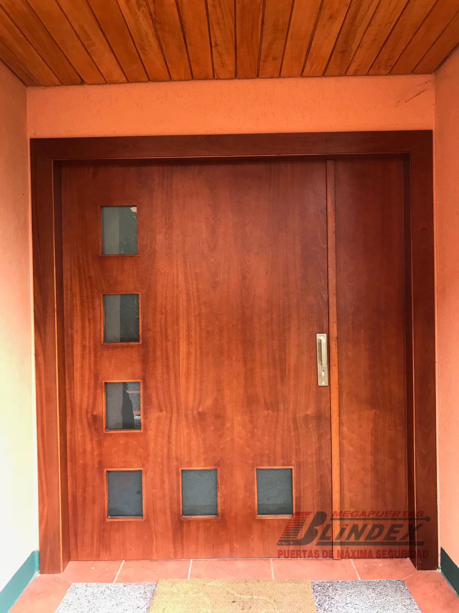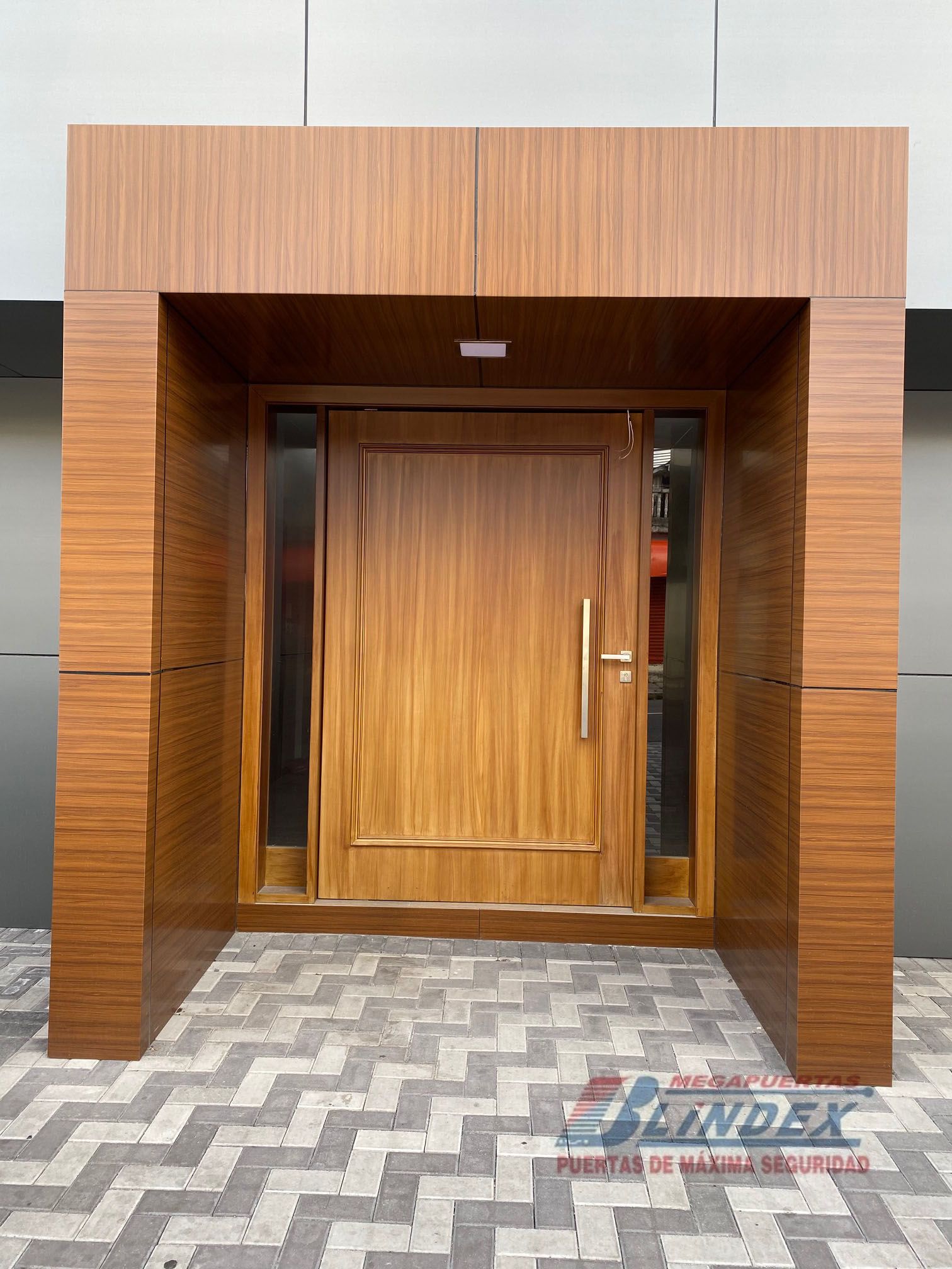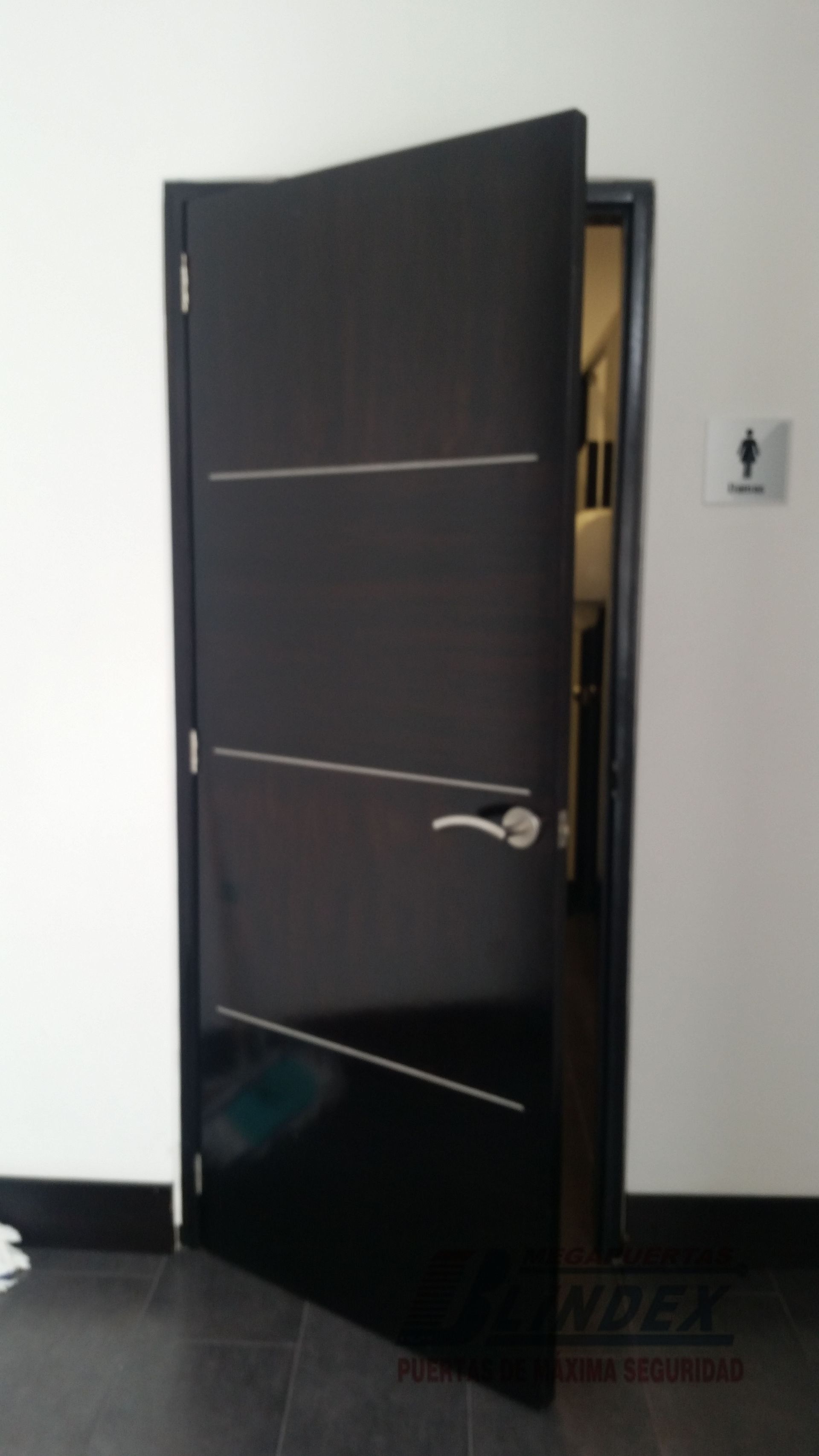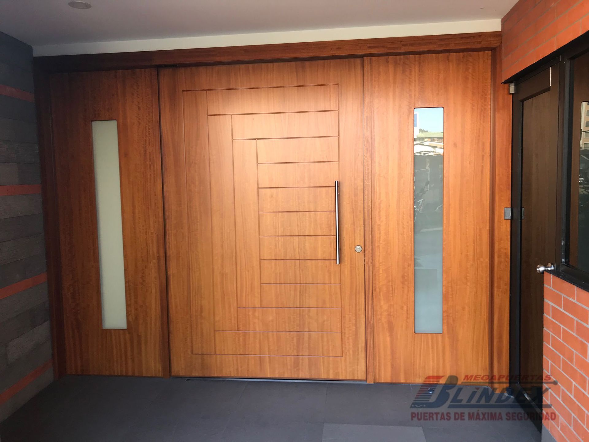 Residencias, comercios, bancos, cuartos de pánico, marcos y hoja en plancha galvanizada con refuerzos anti palanca, omegas internos tipo panal, relleno de lana de roca, cerradura española con 10 puntos de anclaje y enchape en madera.