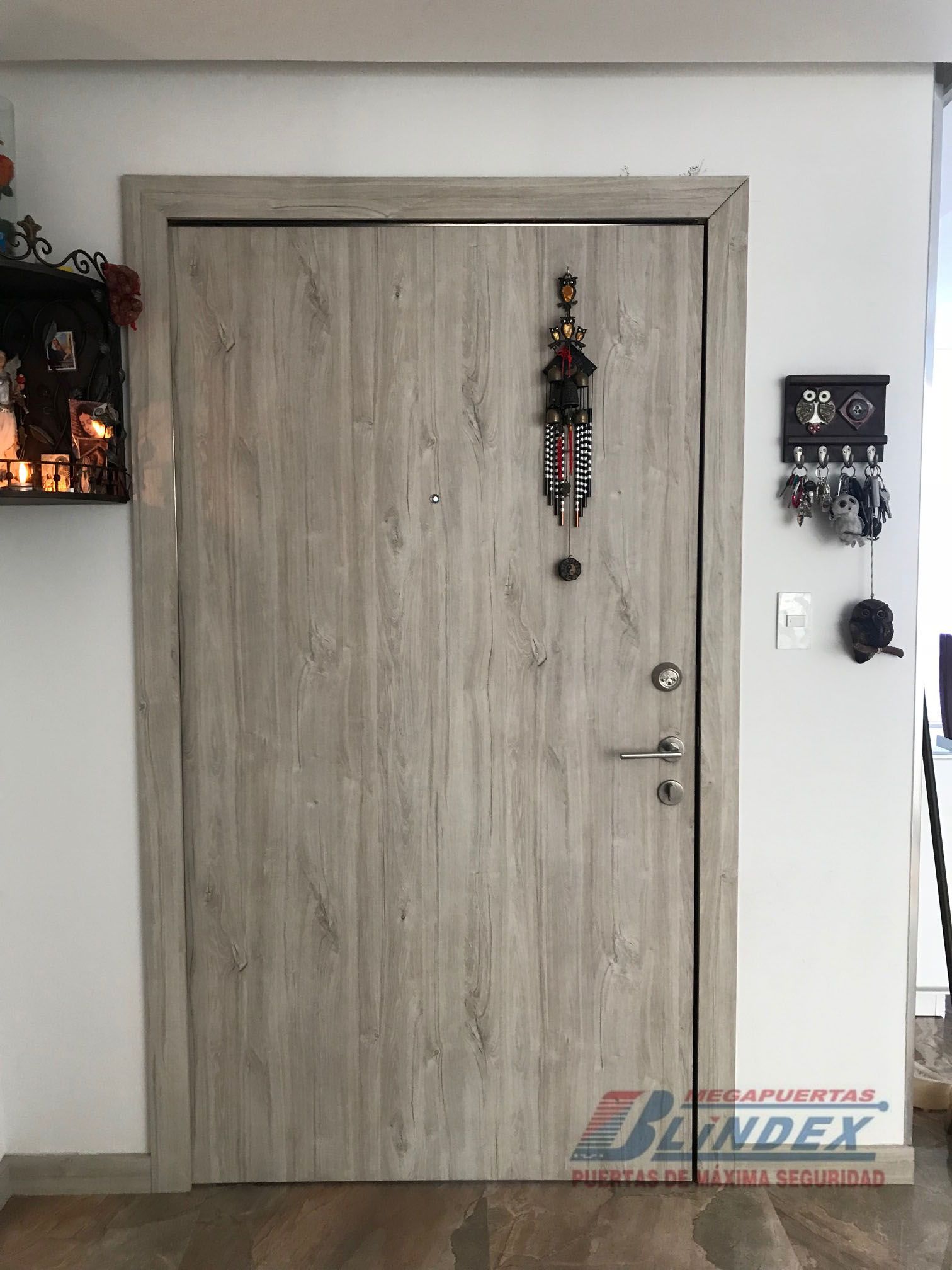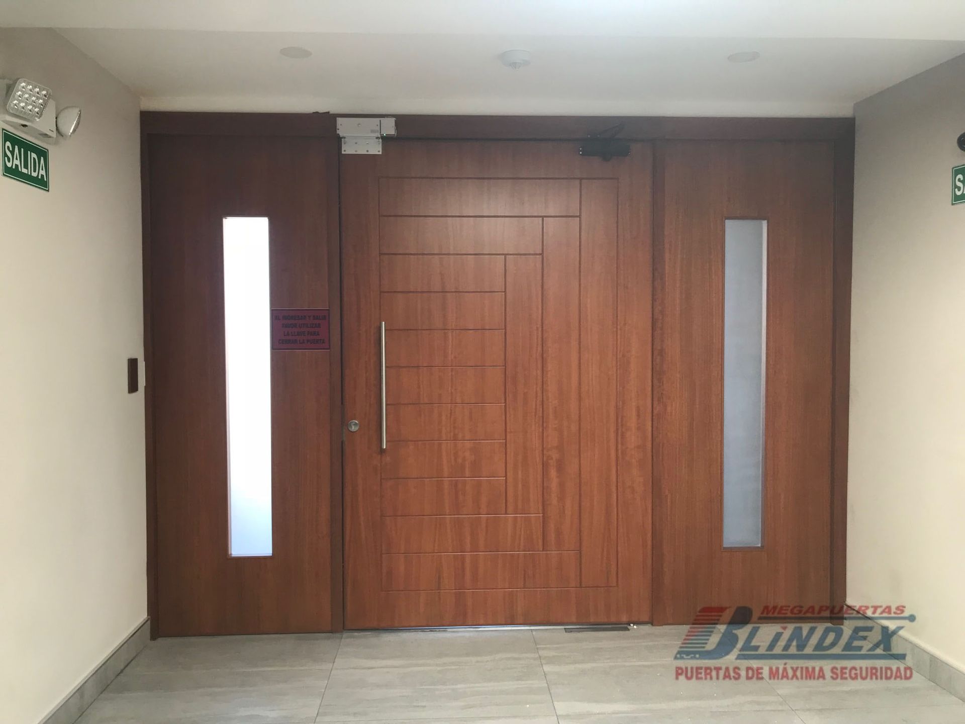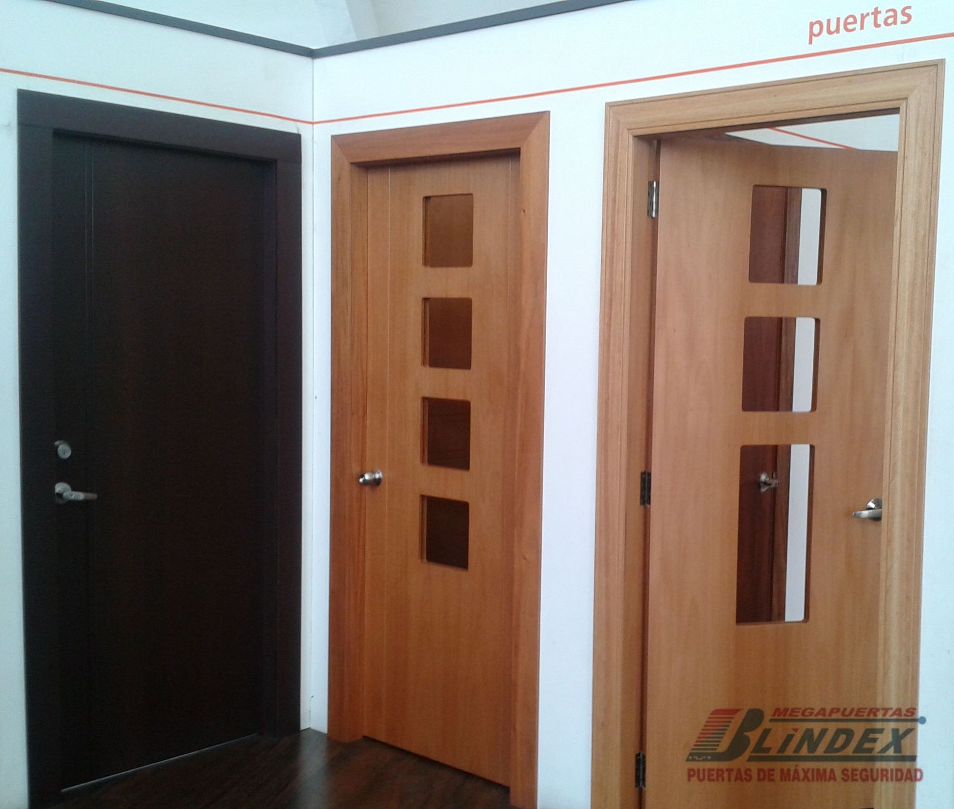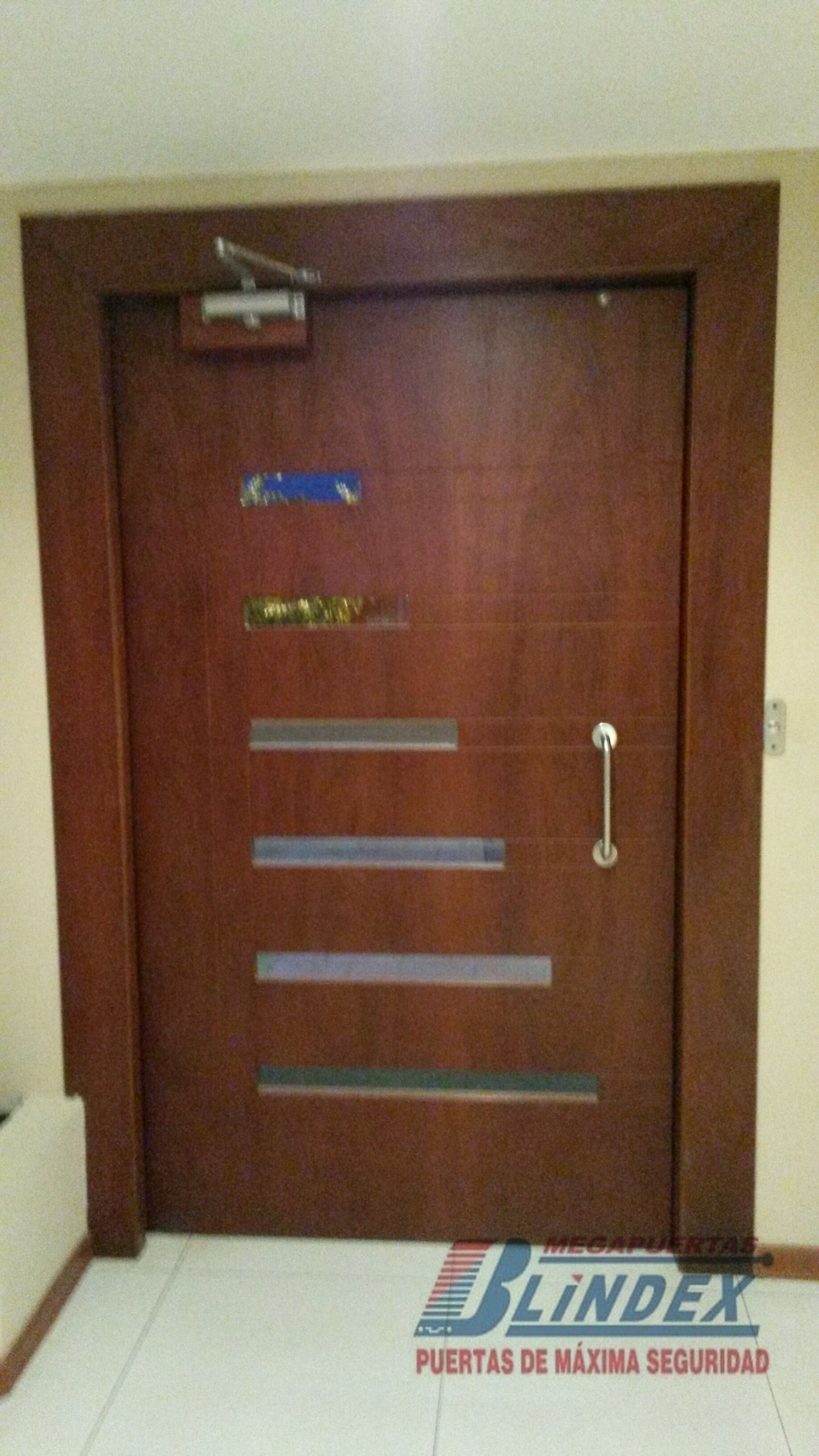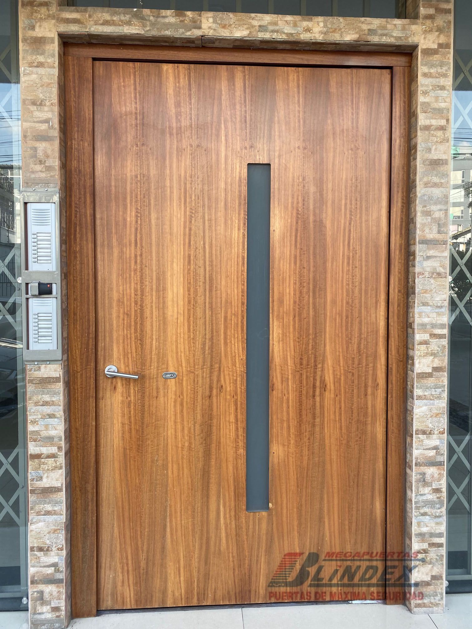 Residencias, comercios, bancos, cuartos de pánico, marcos y hoja en plancha galvanizada con refuerzos anti palanca, omegas internos tipo panal, relleno de lana de roca, cerradura española con 10 puntos de anclaje y enchape en madera.